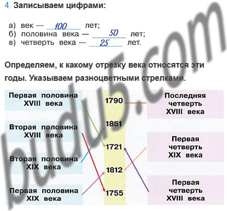 К какому отрезку века относятся эти годы? Укажи разноцветными стрелками.